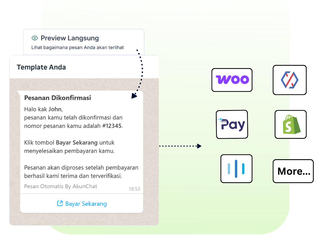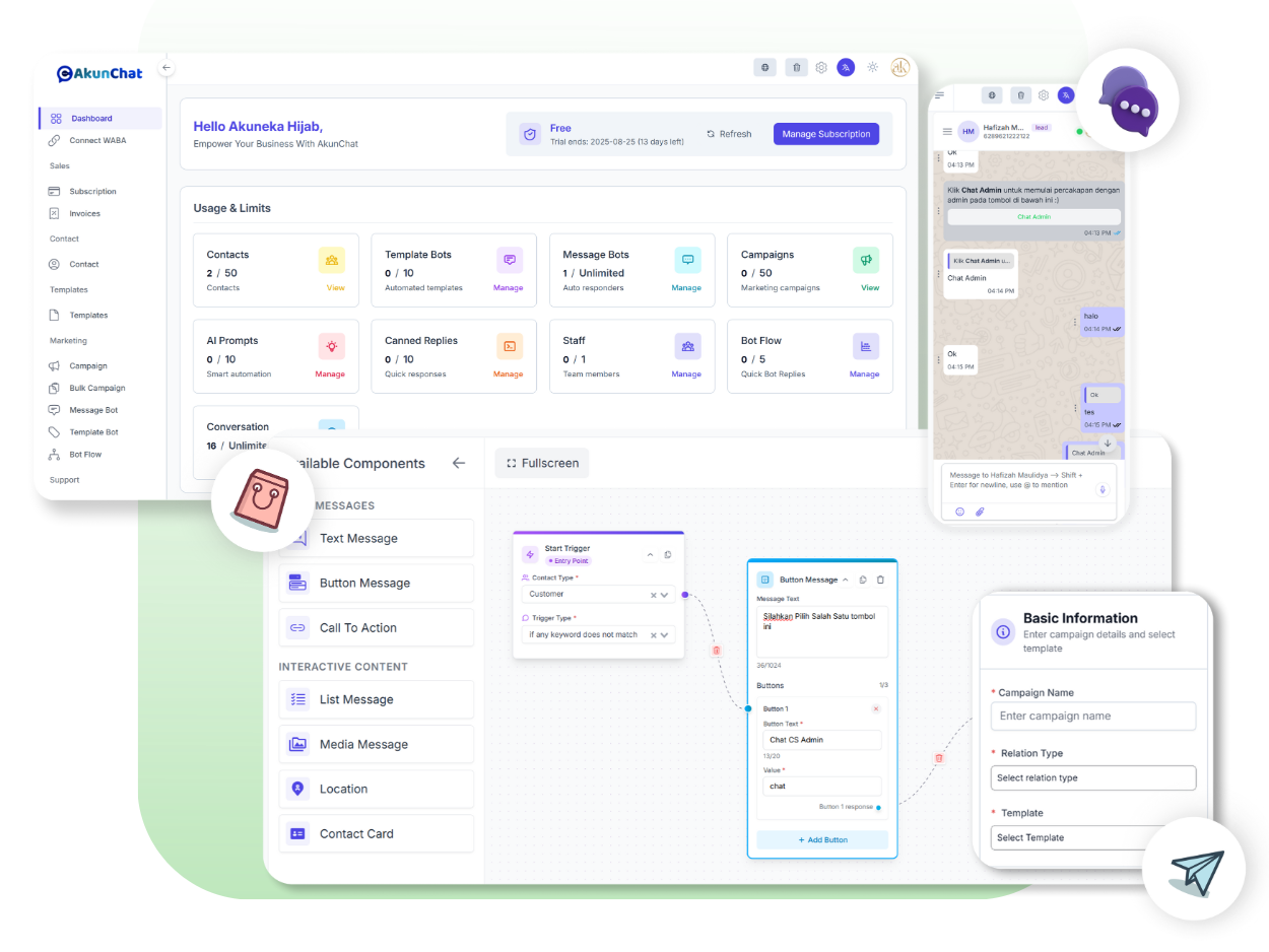 Gak perlu lembur cuma buat balas chat. ChatBot siap jawab pelanggan kapan saja, bikin mereka betah dan pesanan jalan 24 jam. Hemat waktu, tenaga, dan kamu bisa fokus jualan!
